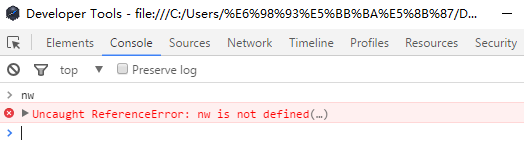 但我们在代码中使用 nw.Window.get().maximize() 来实现窗口最大化时,直接报错 nw is not defined。并且,如果按 F12 开启开发者工具,输入 nw,也会直接报 nw is not defined: