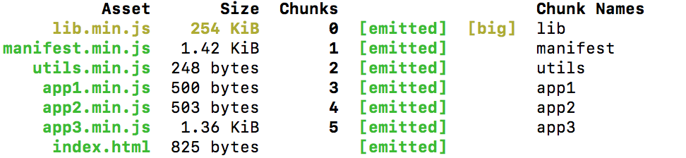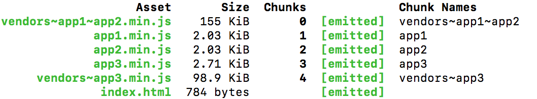 由于 jQuery、Lodash、React、React-dom 未压缩之前的源码都超过了30K,所以它们被分离成独立的文件。由于它们都来自 node_modules,所以这些分离文件的名称前缀是我们的配置 vendors, 接着使用 automaticNameDelimiter 的值(符号 ‘~’)来连接共同引入它们的业务文件名,如 vendors~app1~app2.min.js 和 vendors~app3.min.js。